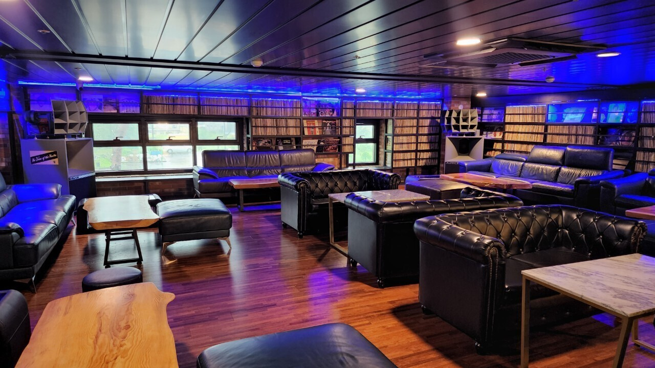또한 2층에는 LP 전시 공간이 마련되어 있어 음악 애호가들에게 또 다른 즐거움을 제공합니다. 약간 올드한 느낌의 소파와 목재 바닥은 레트로한 매력으로 작용하며, 공간의 성격을 한층 분명하게 만듭니다.