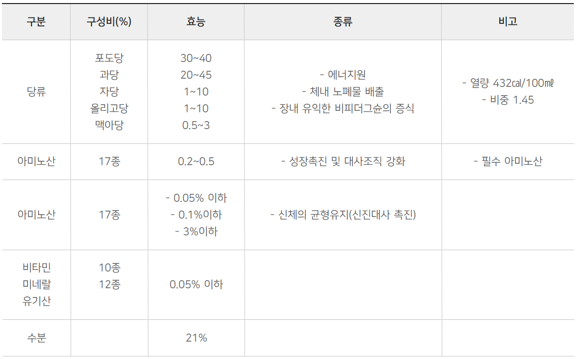 표에서 효능이라고 표기된 것은 비율입니다. 당이 차지하는 비율이 80%에 육박합니다. 수분이 21% 이하여야 합니다. 보통 20% 정도 됩니다. 당이 78% 정도 차지하며 꿀의 2%만이 아미노산과 비타민 미네랄입니다. 특히 비타민과 미네랄 유기산을 모두합쳐봤자 0.05% 입니다. 이게 몸에 좋다구요? 그냥 흙이 더 낫다니까요?