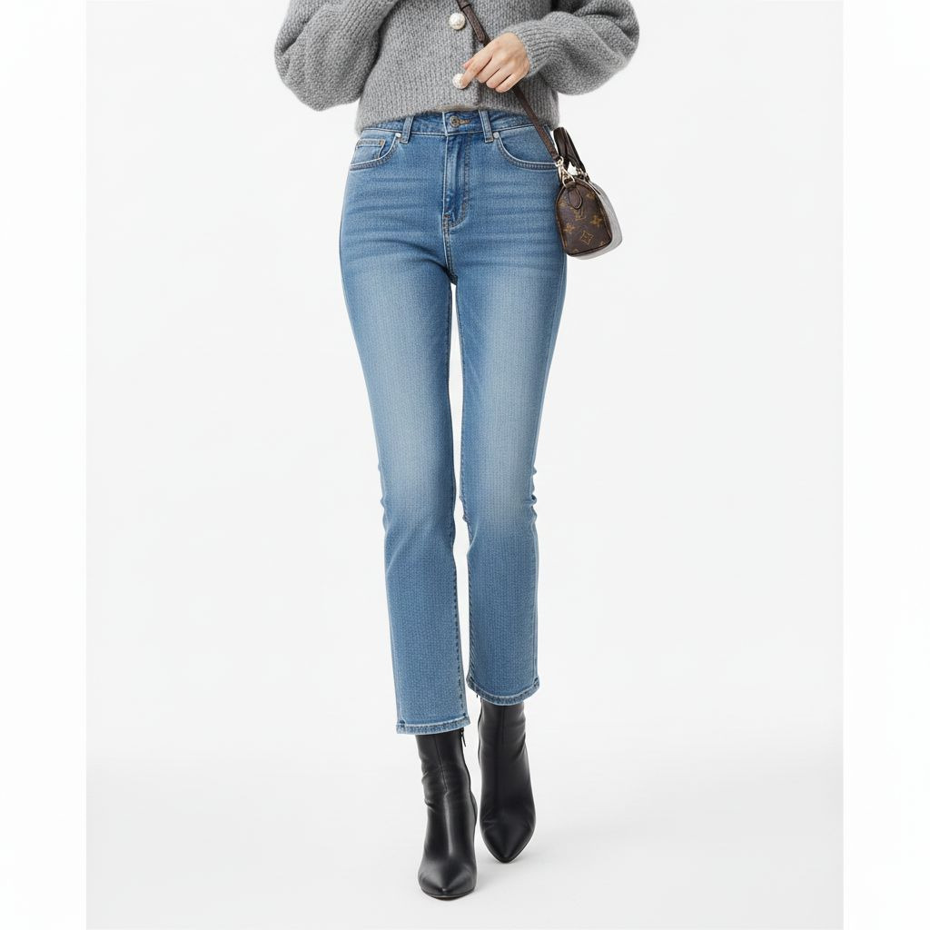 세미 부츠컷은 완전한 부츠컷처럼 과장된 라인이 아니라, 무릎 아래에서 살짝 퍼지는 정도라서 데일리에도 부담이 적고, 다리 라인을 길어 보이게 만들어 줍니다. 또한 라이트 인디고 워시는 상의의 그레이-화이트 톤과 충돌하지 않고 자연스럽게 연결됩니다.