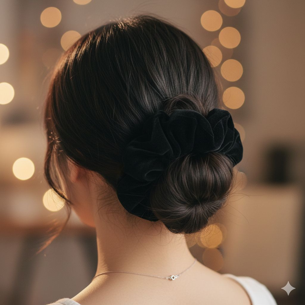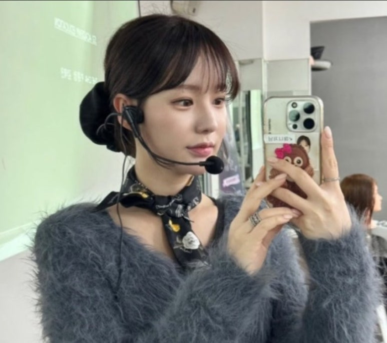 김태인 룩에서 가장 인상적인 마무리는 사실 옷보다 헤어 디테일입니다. 반묶음 헤어에 블랙 리본을 더하는 방식은 너무 흔해 보일 수도 있지만, 이 룩에서는 완성도가 굉장히 높습니다.